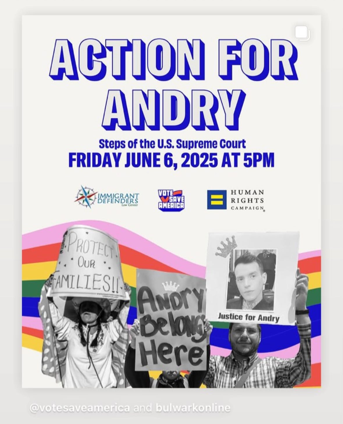 Join Vote Save America, the Human Rights Campaign and the Immigrant Defenders Law Center for a protest in support of Andry José Hernández Romero — Action for Andry, June 6, 5 PM ET. Andry was unjustly and illegally disappeared to CECOT, an El Salvadoran prison known for its human rights abuses. For more information and to sign up to attend, click here.