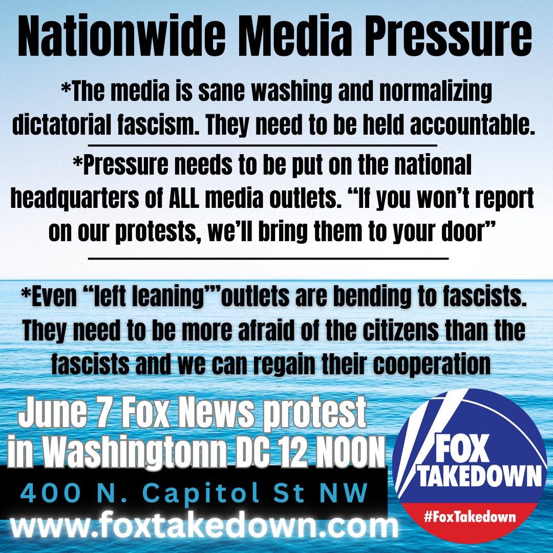 Join the FOX Takedown in front of FOX headquarters, 499 N Capitol St NW, D.C., and tell them that we will NOT accept their sane washing coverage of and normalizing this administration.