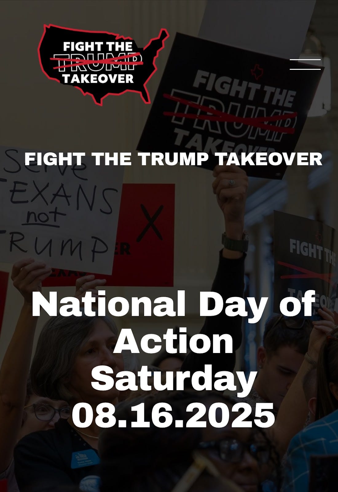 National Day of Action on Aug. 16. Trump is trying to rig the 2026 midterm election by gerrymandering district seats in Texas to add five additional Republican seats. Texas House Democrats have broken quorum to try to stop this. But it won’t stop there: Florida, Indiana, Missouri, and Ohio (and maybe other red states) are also looking to gerrymander their districts to favor Republicans. However, we are fighting back! Join a stop Trump Takeover event by clicking here. Use this toolkit from DemCast to counter the Texas gerrymandering.