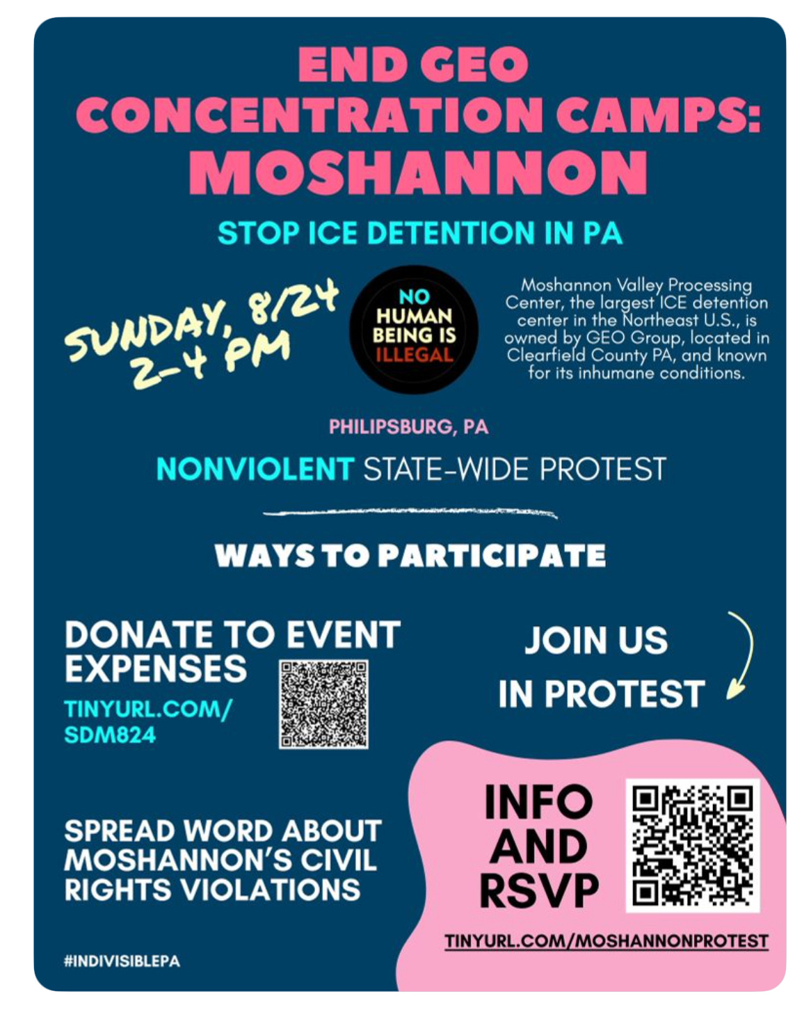 Join Indivisible in a statewide protest in Pennsylvania on Sunday, Aug. 24, 2–4 PM ET, to demand the closure of the Moshannon Valley Processing Center ICE facility, one of the largest in the Northeast. Click here to sign up.