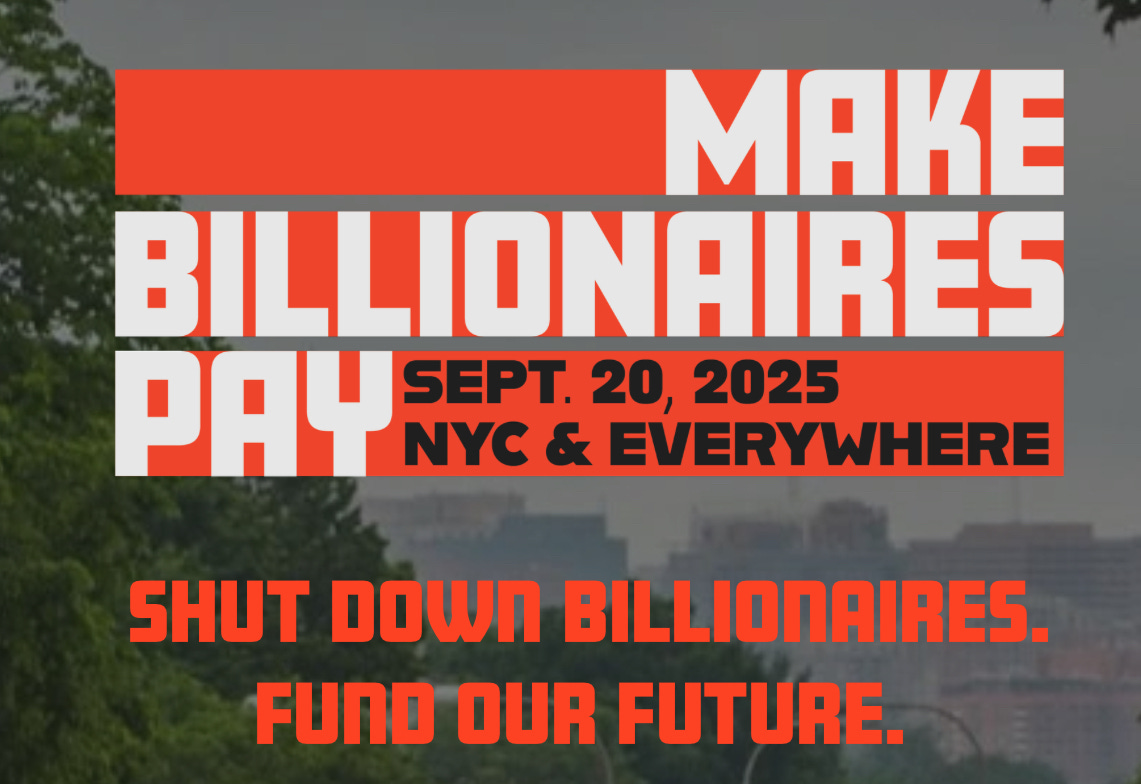 On Sept. 20, join the Make Billionaires Pay rally. World leaders will be gathering for the U.N. General Assembly and Climate Week in New York City. It’s a moment to show the world that we are revolting against Trump and his billionaires and oligarchs who are trying to take over our country with authoritarian rule. Simultaneous actions will be happening nationally and globally. Click here for more information and to find a location near you.