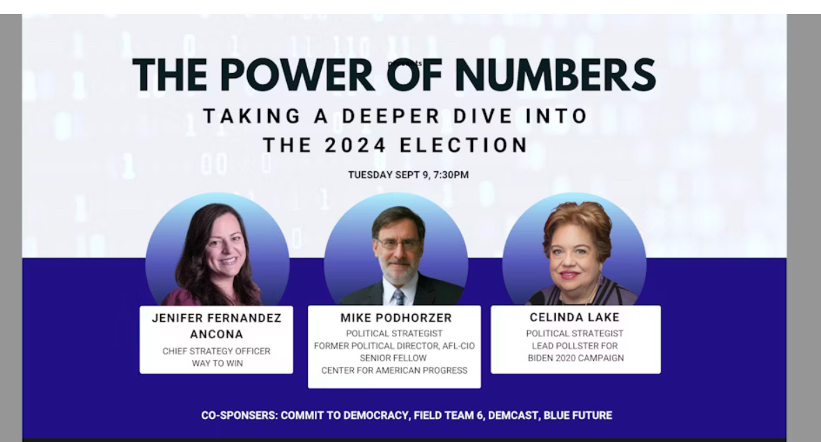 Join The Power of Numbers: Taking a Deeper Dive into the 2024 Election, Tuesday, Sept. 9, 7:30–8:30 PM ET. In 2024 voters did not show up in numbers for Kamala Harris like they did for Joe Biden in 2020. Lake Research and Way to Win did a deep survey of those voters. Join Volunteer Blue to hear Celinda Lake, Jenifer Fernandez Ancona, and Mike Podhorzer explain what the survey found, who these voters are, why they did not vote, and how we can reach them for the upcoming elections. Sign up here.