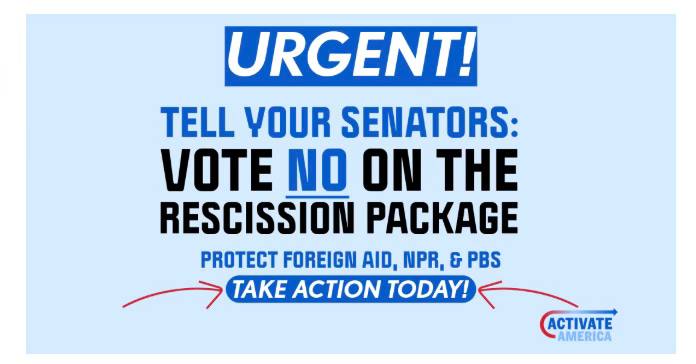 Tell your senators to vote NO on Trump’s rescission package and protect foreign aid, NPR, PBS, world hunger, HIV/AIDS prevention, and more. These funds have already been allocated and Trump and the GOP want to slash them. Contact your senators here: