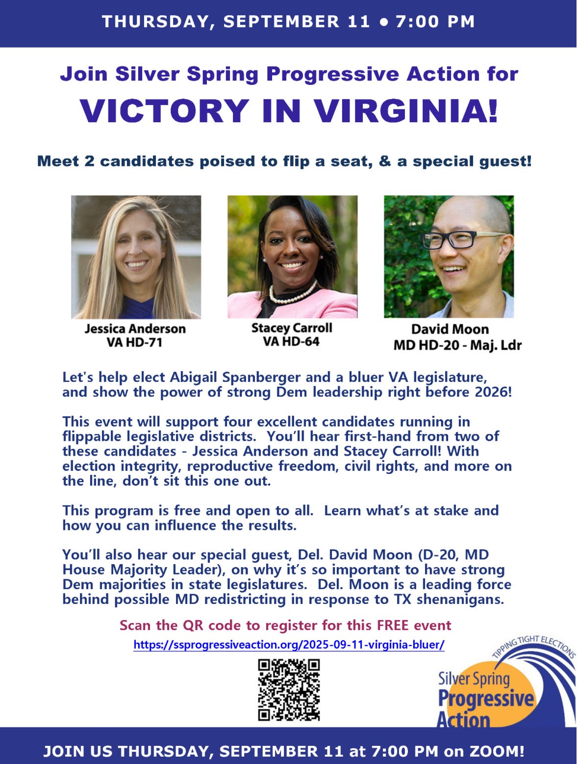 Silver Spring Progressive Action is hosting a phone bank to call Virginia voters on Monday, Sept. 15, 6:30–8 PM ET. We will be phonebanking for Abigail Spanberger for governor and a delegate for the VA House. Virginia needs to expand their 51-49 Democratic majority in the House of Delegate, and elect Abigail Spanberger governor to deliver a Democratic trifecta. This will mitigate the damages Trump has done while also trying to bring economic relief to Virginians. Whether you're a first-time caller or a seasoned pro, training will be provided. Please sign up here and let’s flip these seats!
