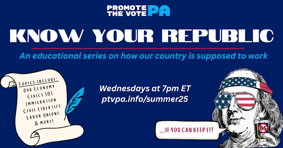 Join Know Your Republic: How Our Government is Supposed to Work with Promote the Vote PA. Experts will speak on the Labor Movement, Sept. 17, 7 PM ET. Click here to sign up.