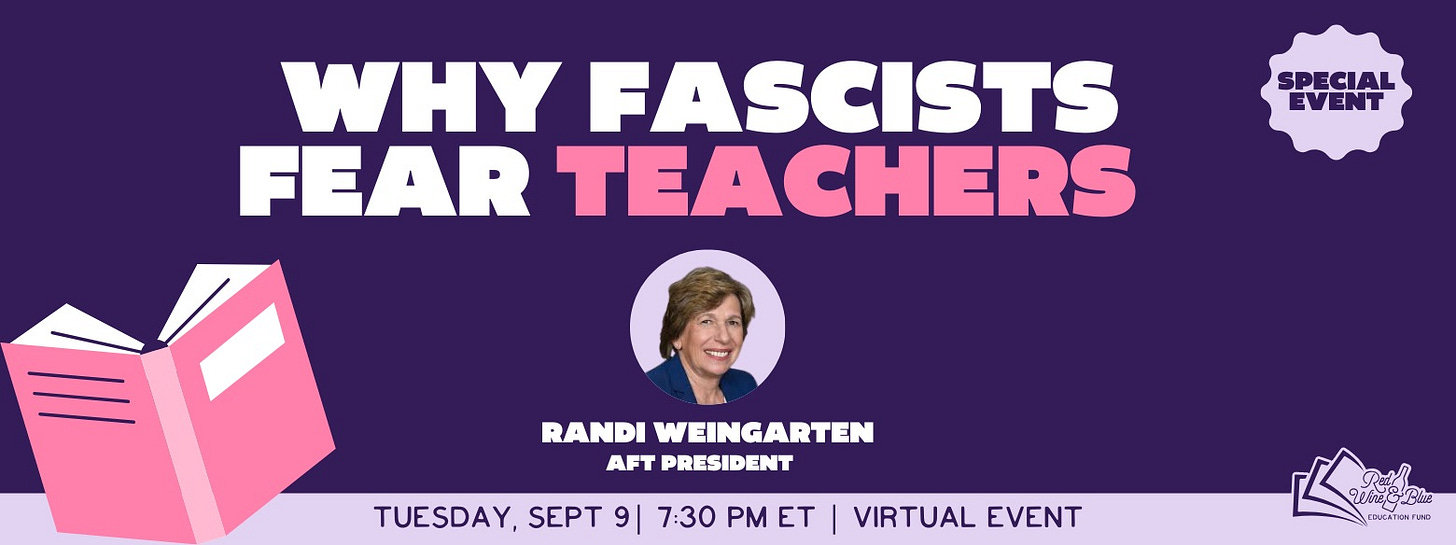 Join Red Wine & Blue’s virtual event, Why Fascists Fear Teachers w/Randi Weingarten on Tuesday, Sept. 9, 7:30–8:30 PM ET. They’ll expose the organized attack on education and explain why fascists fear values like curiosity and empathy. Discover what’s at risk, how these assaults harm our children and our nation, and what we can do to push back. Sign up here.