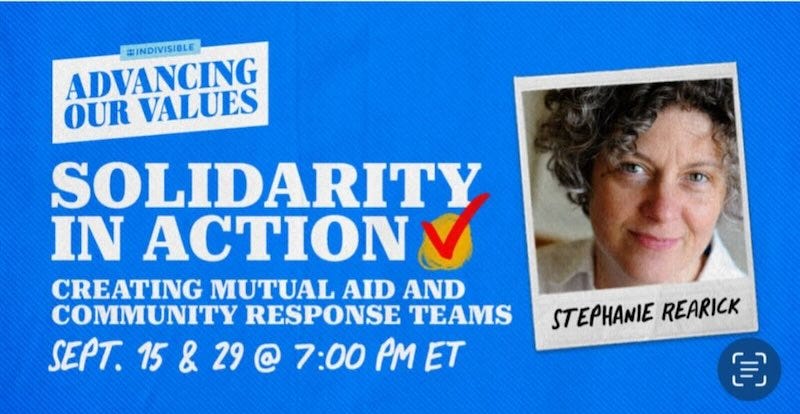Red Wine & Blue has more events scheduled. Click here to sign up for them.Join Indivisible’s next Solidarity in Action Speaker Series event in a two-part series on Monday, Sept. 15 and Monday, Sept. 29. Learn about mutual aid and community response teams with special guest Stephanie Rearick.