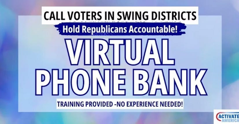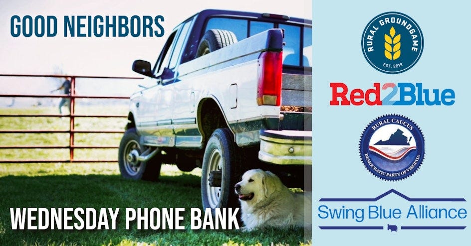 Join the Good Neighbors Fight for Home weekly phone banks on Wednesdays, 6–8 PM ET, to talk with Virginia voters about threats to essential services and the importance of voting this year. This event is hosted by the Rural Caucus of the Democratic Party of Virginia, Red2Blue, Swing Blue Alliance, and others. Sign up here.