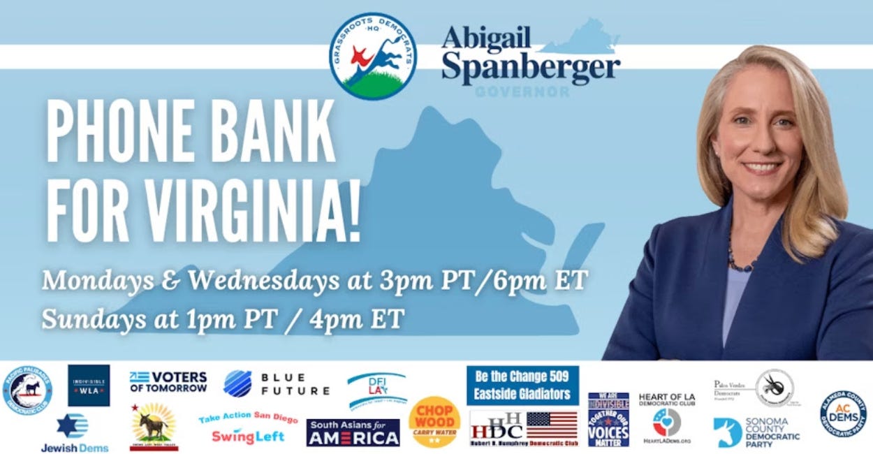 “Are you ready to make calls and talk to voters to ensure we elect Abigail Spanberger as Virginia's next Governor? Join us on Mondays and Wednesdays at 6PM ET and Sundays at 4PM ET to call voters across the state! No worries if you've never phone banked before. We will provide a full training!”