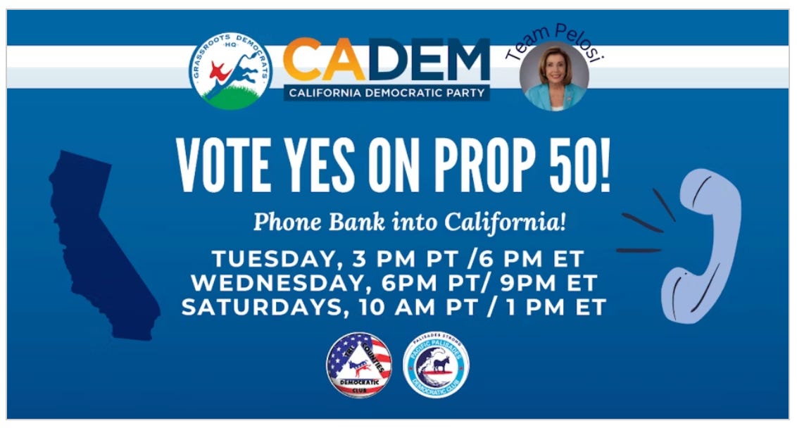 The California Democratic Party and Team Pelosi are inviting us to join a Vote Yes on Prop 50 phone bank to help stop the Trump/MAGA agenda.