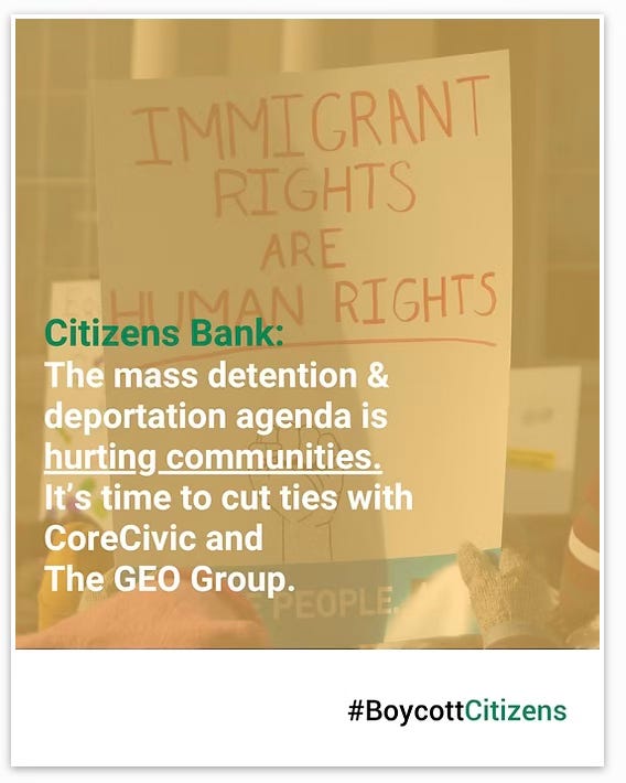 “Citizens Bank says it’s strengthening communities, but has continued financing CoreCivic and GEO Group as other lenders have cut ties. Private prisons and the mass detention, deportation, and surveillance of immigrants don't strengthen our communities; they hurt our neighbors. Citizens must stop financing CoreCivic and GEO Group.”