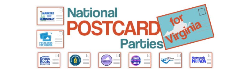 “Postcards4VA is hosting National Postcard Parties for Virginia because this election is a bellwether, and postcards make a real difference!”