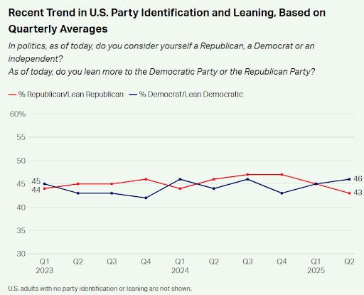 “Long-term Gallup surveys show that since the 2024 election, so many Americans have abandoned the Republican Party that Democrats have regained their advantage in party affiliation.”