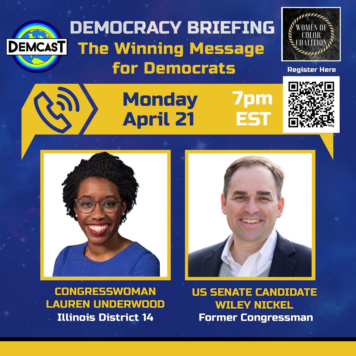 Join DemCast & our guests Rep. Lauren Underwood and Senate Candidate Wiley Nickel this Monday at 7pm ET.