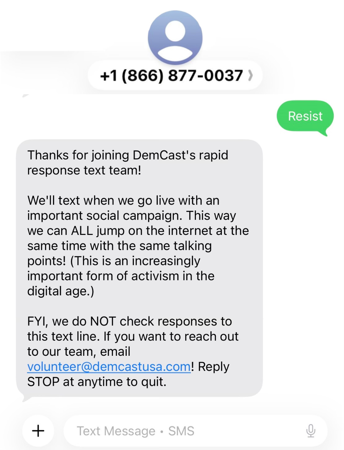 If you’d like to join the team, it’s super easy. Just text Resist to (866) 877-0037. Here’s what it looks like to sign up: