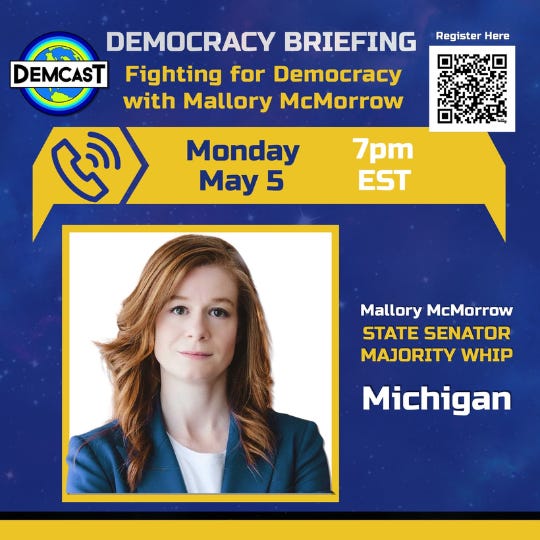 Join our Democracy Briefing TONIGHT at 7 ET/4 PT for a conversation with rising Democratic star Mallory McMorrow!