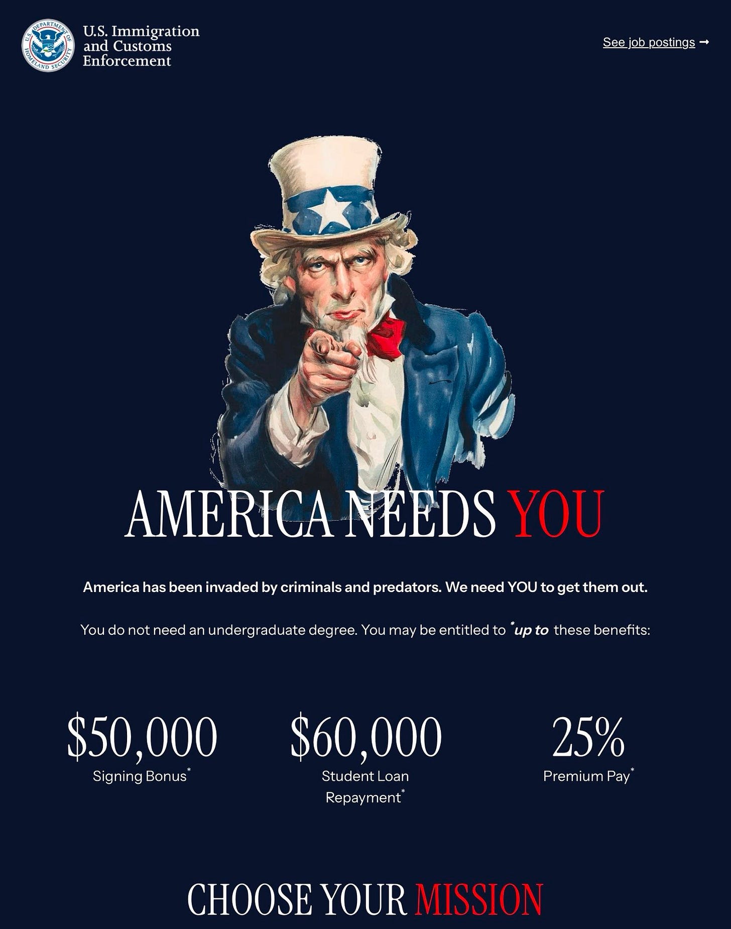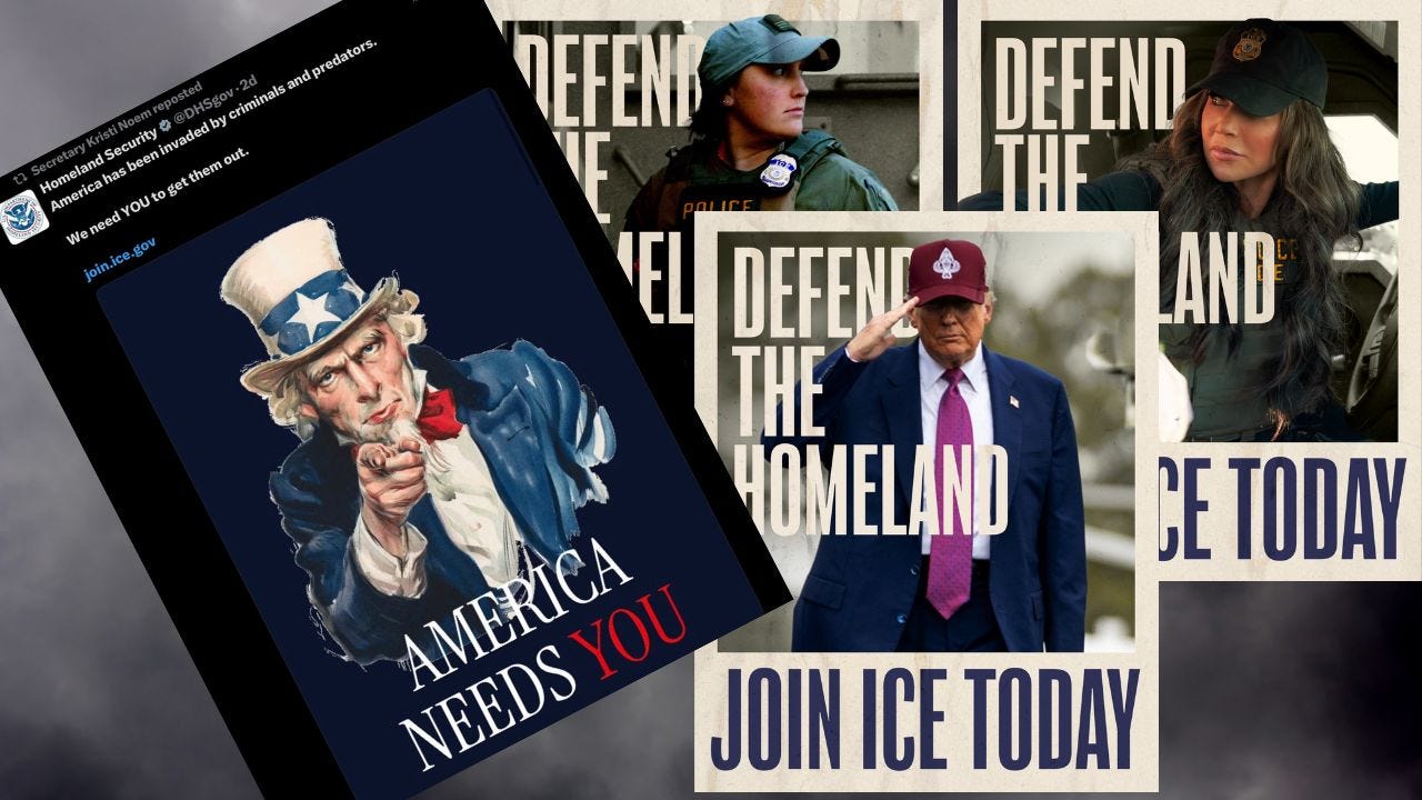 DHS floods college campuses, job fairs, and police networks with posters that evoke World War II propaganda. Images of Uncle Sam, Trump, and cosplay Kristi Noem urge “patriots” to remove “criminal illegal aliens.” This campaign isn’t about immigration enforcement—it’s a white Christian nationalist crusade aimed at reshaping America. Anyone who’s read Project 2025 saw this coming. These plans aren’t secret—they’re spelled out in black and white: racist, authoritarian, and ready to be enforced.