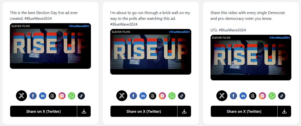 The Best Election Day Ad Ever.Eleven Films really outdid themselves this time.DemCast USA and Nick KnudsenNov 04, 20241291666ShareSubscribeWatch This Amazing Ad:Share This Amazing Ad:Hey - guess what?You can send this pump-up GOTV video to your friends and followers!Just click the toolkit below and share some posts!Hashtag: #BlueWave2024Click to Access the Toolkit!Please like and restack this post so that more people see it!PreviousNext