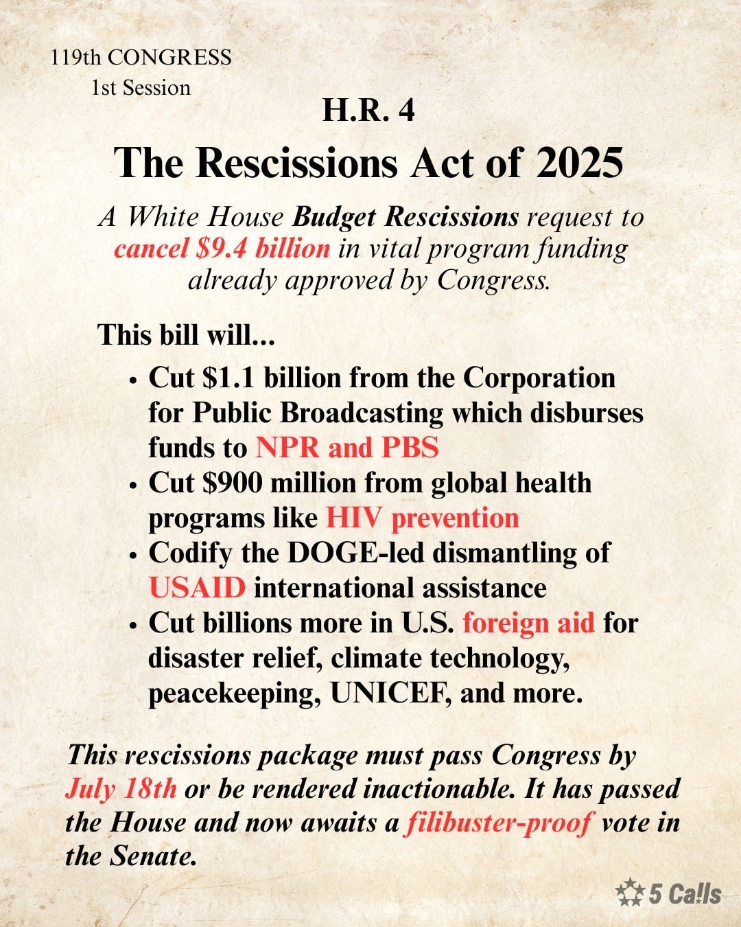 In a week where most eyes are on Supreme Court rulings and campaign chaos, a quieter but deeply consequential bill is hurtling toward the Senate floor. It's called the Rescissions Act of 2025, and it’s the Trump administration’s first formal push to roll back federal spending—and seize power from Congress— targeting $9.4 billion in already-approved funding. The bill narrowly passed the House in June and must hit Trump’s desk by July 18 to take effect.