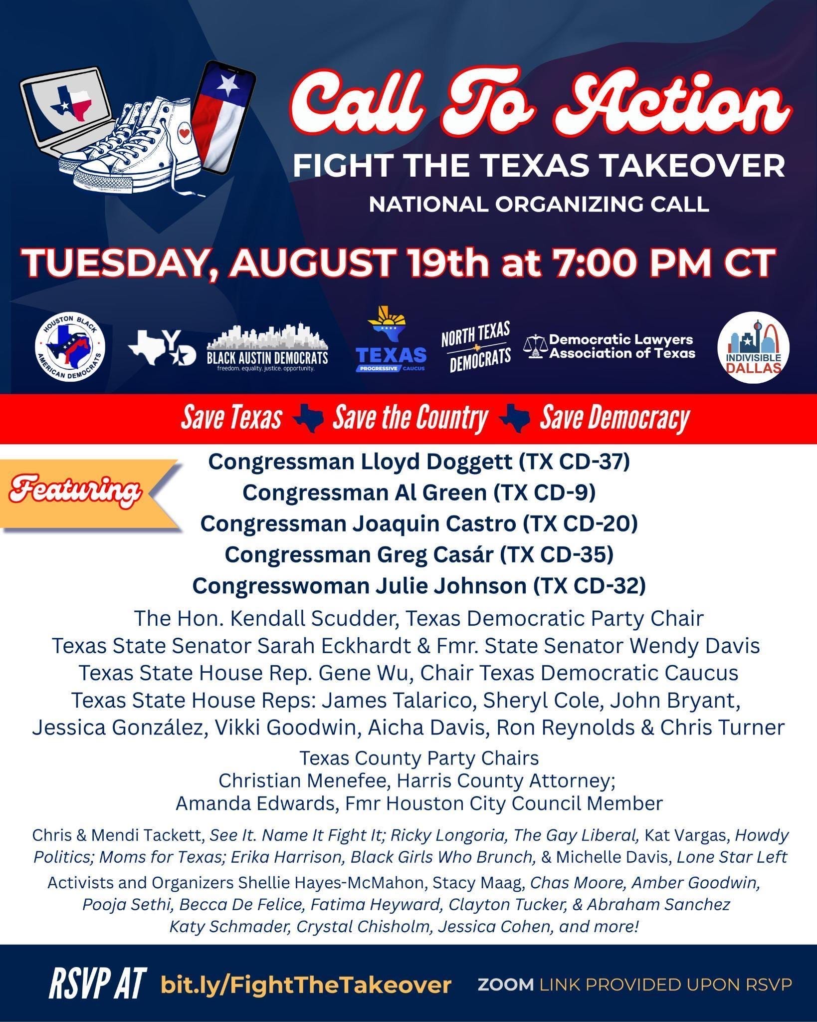 Join Texas Congresspeople, Representatives, politicians, and other activists TONIGHT at 7PM CT to stand with Texas Democrats as they fight back against the Republican authoritarian regime.