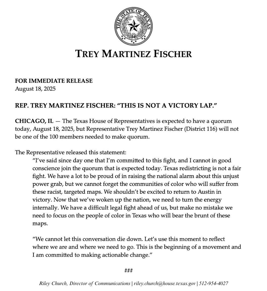 In Chicago, Democratic Caucus Chair Trey Martinez Fischer continues to fight from exile. His walkout isn’t delay—it is a barricade against Trumpist engineering in a state with the nation’s second-largest Latino and Black populations.